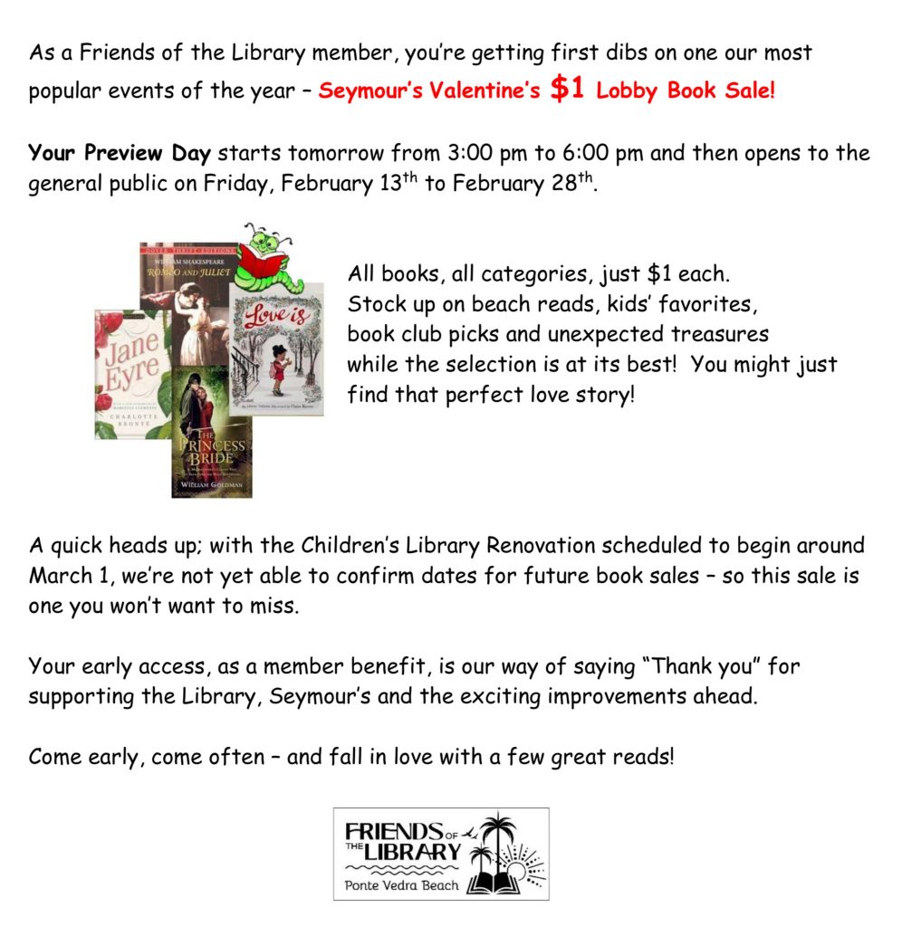 Every purchase at Seymour’s directly supports the Ponte Vedra Beach Branch Library. Proceeds from book sales, along with annual FOL membership dues, help fund essential library enhancements, including this year’s planned Children’s Library remodel, as well as new materials, equipment, and over 95% of the library’s programs.